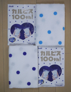 イオンでカルピス原液2本でタオルが貰えました。キャンペーンの方が2本で1個をサービスで1本ごとにおまけしてくれました。かき氷にも使えると言っていたので、いいかな!と購入。カルピス柄かわいいです。でもこのタオルかなりペラペラ。温泉のおまけのタオルの厚さです。もっと厚みが欲しい。もっといいタオルの質だとおまけとしてはうれしいかも・・・!まあとりあえず綿100%だけはキープしているので良しとしますかね!