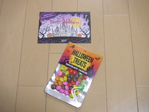 絵柄も素敵ですね。いつものようにただスタンプを押すだけでない、絵柄が完成するので素敵なカードの完成です。貰えるはハロウィンのお菓子も素敵です。