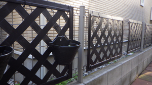 お隣さん敷地から雑草が見えたり丸見えで嫌だなということで、柵に茶色の柵を取り付けました。100円ショップで300円商品として売っているものですが、とても上品で使いやすいです。