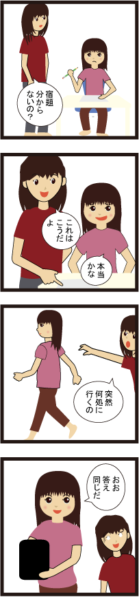 学校の宿題を 公開済み: 2021年9月10日更新: 2021年9月10日作成者: bibibbb30@カテゴリー: 4コマ 宿題が分からない子供 「どこが分からないの?」と教えていると・・・ 突然何処かにいってしまうのです・・・・ おい。どこに行くの・・・ すると突然タブレットを操作して、計算式を音声入力し、 「合ってる合ってる」と言ってきて答えを確認してくるのでした・・・・ 怖いね。 まあ合っていたからいいけど、怖い世の中です。 関連記事 UFOキャッチャーにて UFOキャッチャーが結構好きな娘です。 そんな娘がびっくりなことをいってきたので、驚きました。 ミニーのことをなんとミッキーの偽物というのでした・・・ リボンを付けた偽物だと思ってったって~ ディズニーが好きじゃない娘・ […] 公開済み: 2023年3月21日更新: 2023年3月21日作成者: bibibbb30@カテゴリー: 4コマタグ: UFOキャッチャー 真夏に車に乗り込もうとすると 久しぶりの4コマです。描きたいことはありますが、なかなか描くことが面倒で・・・・描いてません。。。 最近暑いですよね?暑いから最初に車に行っていいよっていうと、どうぞお先にと娘が譲ってきます。ではと私が開けて車の取っ手を […] 公開済み: 2020年8月27日更新: 2020年11月26日作成者: bibibbb30@カテゴリー: 4コマ ドーナッツを買ってきたら ドーナッツを買ってきたらお腹がいっぱいなので、食べれないということが多いです。 まあ食べれないのね。そんな時もあるよね。 しばらくして食べるよ。 と呼んでみると、もうすでにちょっと食べかけのドーナッツがあるのです。 ほん […] 公開済み: 2020年11月26日更新: 2020年11月26日作成者: bibibbb30@カテゴリー: 4コマタグ: ドーナッツ この投稿へのコメント コメントはありません。 コメントを残す コメントをキャンセルメールアドレスが公開されることはありません。 ※ が付いている欄は必須項目ですコメント ※ 名前 ※ メール ※ サイト 次回のコメントで使用するためブラウザーに自分の名前、メールアドレス、サイトを保存する。 上に表示された文字を入力してください。 Δ この投稿へのトラックバック トラックバックはありません。 トラックバック URL