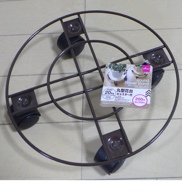 ダイソーのワイヤーバスケットは500円+キャスター付き花台は200円なので、700円でガーデンラック ワイヤーキャスター付きの完成です。