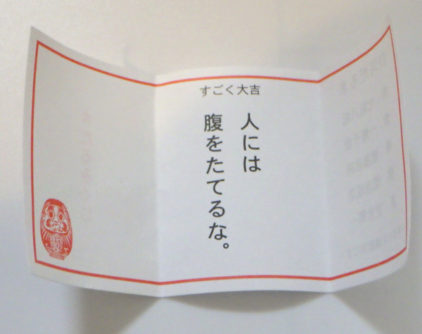 ワンコイン#だるみくじを引いてみる 公開済み: 2023年1月2日更新: 2023年1月2日作成者: bibibbb30@カテゴリー: 買い物タグ: #だるみくじ ヨーカドーにワンコイン(500円)でダルマ付きのガチャがあり、やってみました。だるまの色によっても違うようで、青は安全第一だそうです。まあ無難な感じですよね。しかし!内容がとても大吉とは思えないような内容なんですけど!すごく大吉 【人には腹をたてるな。】え~大吉ですかね!!!なかなか面白いおみくじですね。 関連記事 06 ピュアシャワーUVカットジェル ミニサイズ ピュアシャワー UVカットジェル (SPF30/PA+++)50g価格:780円(税込、送料別) UVカットジェル ミニサイズ でかばんに取り付けられるので便利です。 一度かばんで日焼け止めがこぼれ、携帯電話が壊れました […] 公開済み: 2015年6月6日更新: 作成者: bibibbb30@カテゴリー: 買い物タグ: UVカットジェル ミニサイズ, ピュアシャワーUVカットジェル ミニサイズ Panasonic 電動自転車 スペアキーを購入する Panasonic 電動自転車の鍵は3つありました。 数年前に一つ無くしてしまい購入するか迷いましたが、その時は結構値段がするしと購入しませんでした。 今日は出かけようとしたら鍵がない!!! 最後の一つとなってしまいまし […] 公開済み: 2022年2月15日更新: 2022年2月16日作成者: bibibbb30@カテゴリー: 買い物 77667 [組合せ風呂ふた 3枚組 W-14]を購入 お風呂の蓋って難しいですね。 丸くなってものを使っていたのですが、掃除が面倒ですし、プラ部分の連結に亀裂を発見。 これはもうだめだなと新しいものを探すと高い。 うちのお風呂のサイズの蓋が無い・・・ 組合せサイズ(実寸): […] 公開済み: 2025年3月4日更新: 2025年3月5日作成者: bibibbb30@カテゴリー: 買い物 この投稿へのコメント コメントはありません。 コメントを残す コメントをキャンセルメールアドレスが公開されることはありません。 ※ が付いている欄は必須項目ですコメント ※ 名前 ※ メール ※ サイト 次回のコメントで使用するためブラウザーに自分の名前、メールアドレス、サイトを保存する。 上に表示された文字を入力してください。 Δ この投稿へのトラックバック トラックバックはありません。 トラックバック URL