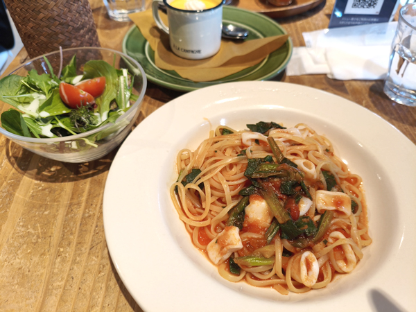子供は成生ハムとレッドチェダーチーズのカスクートプレート、やわらかヤリイカと小松菜のトマトソースパスタを食べました。